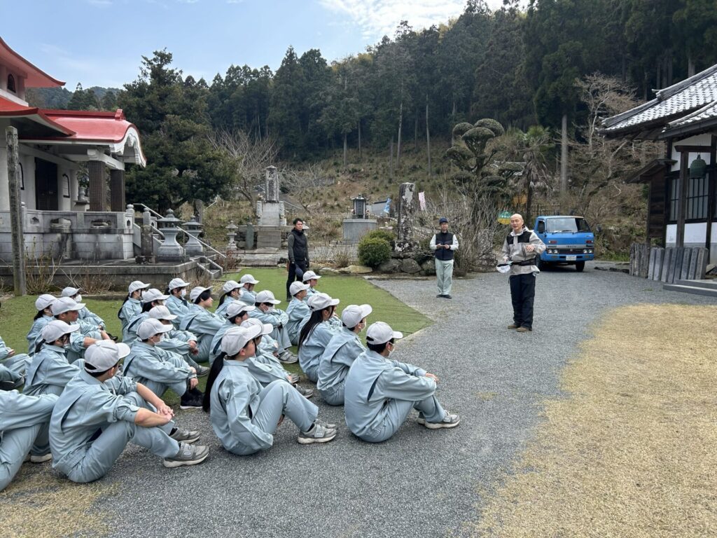 住職から実習の趣旨を説明していただきました。画像の上部(奥の山)に数多くあじさいが植えられていました。