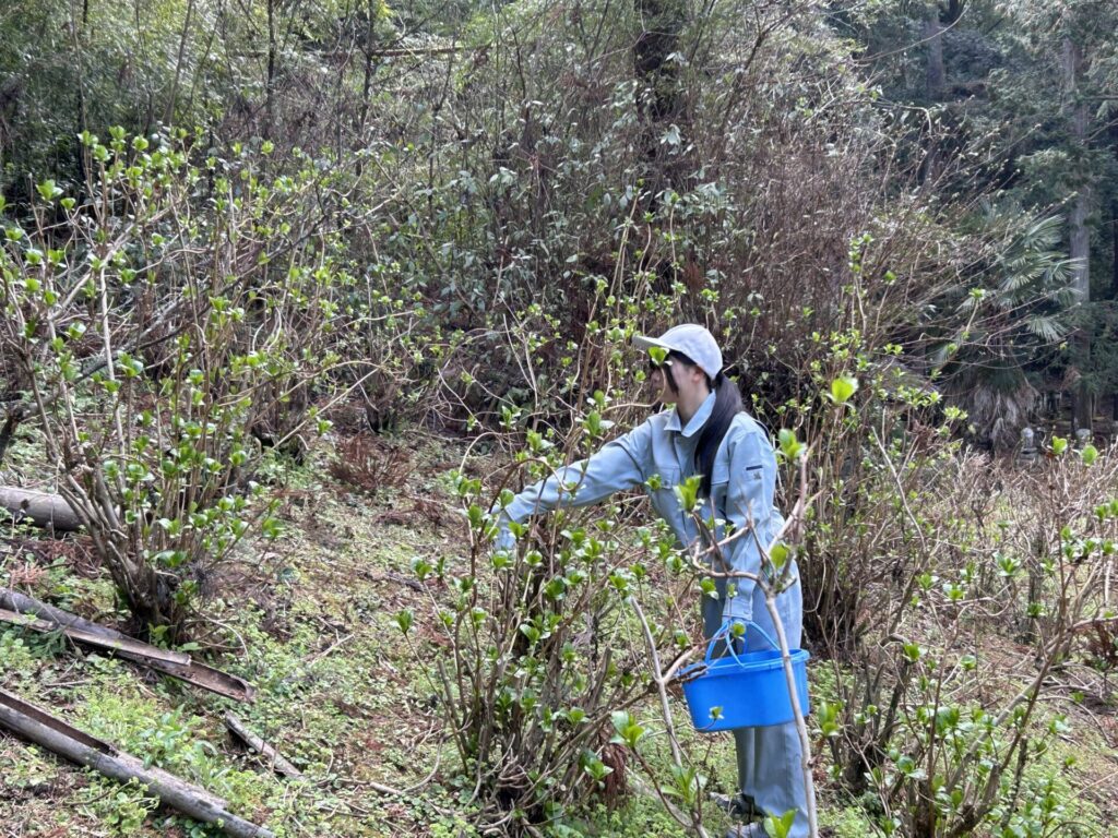 アジサイはすでに新芽が芽吹いていました。地域の歴史や文化に触れると同時に、私たちが学んでいることが社会に貢献できていると感じる実習でした。たくさんの花が咲いてくれることを願っています。