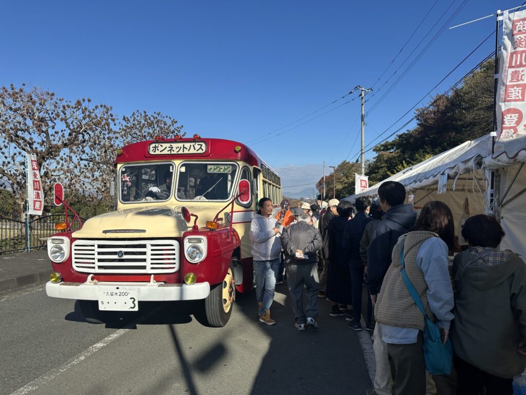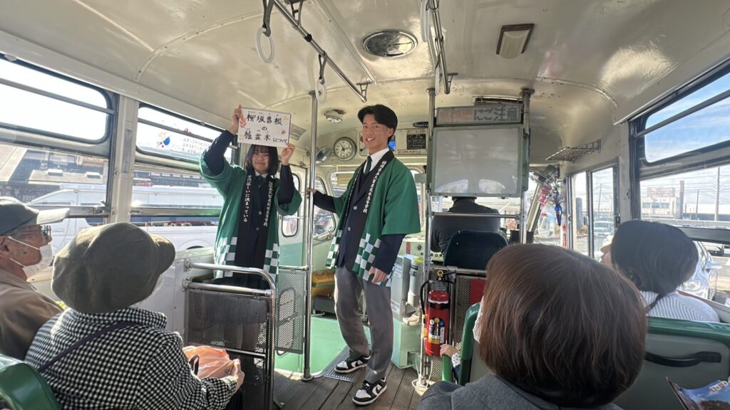 30日にはボンネットバスに乗車し、バスガイドを行いました。はじめての経験で緊張している様子でしたがお客様の温かい声援のおかげで無事に終えることが出来ました。約300名以上の方に乗車いただきました!