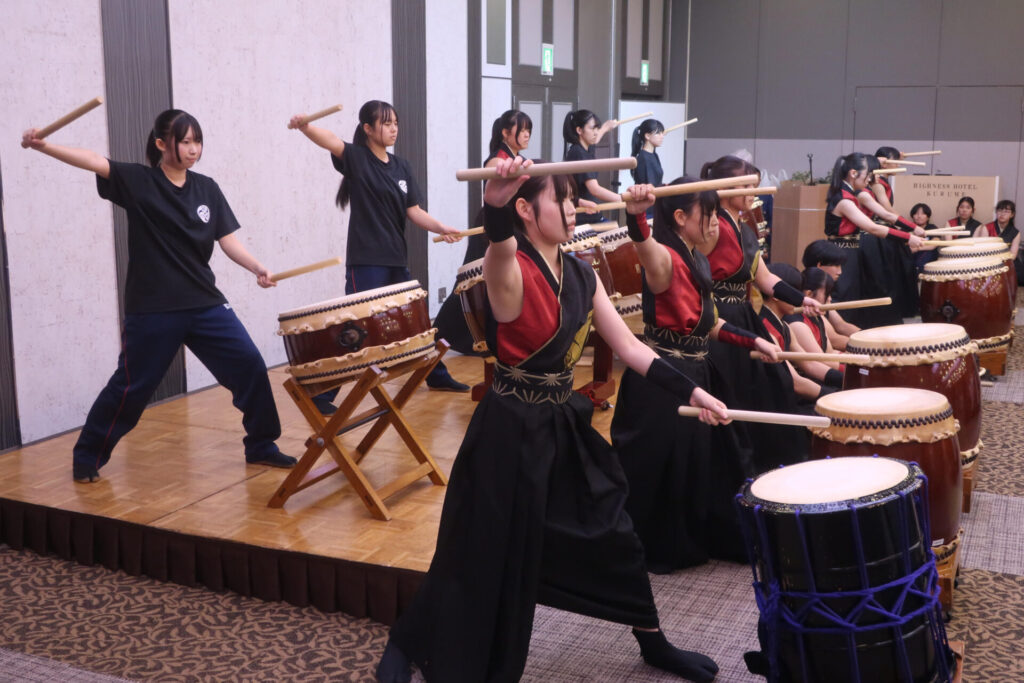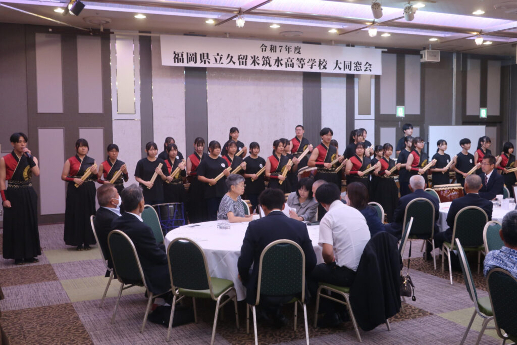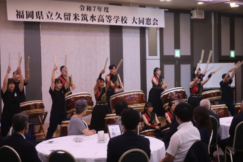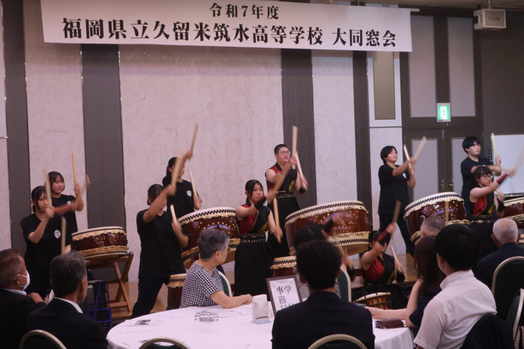 令和7年9月6日土曜日に、ハイネスホテルにて開催された『福岡県立久留米筑水高等学校大同窓会』にて、本校和太鼓部の演奏を3曲披露させていただきました☆大先輩方の前で行う演奏に、裏ではかなり緊張している様子でしたが、演奏前に校長先生から激励のお言葉をいただいたり、会場の皆様からは、暖かい拍手で出迎えていただいたりしたことから、楽しく・力強く演奏することができていました°˖✧