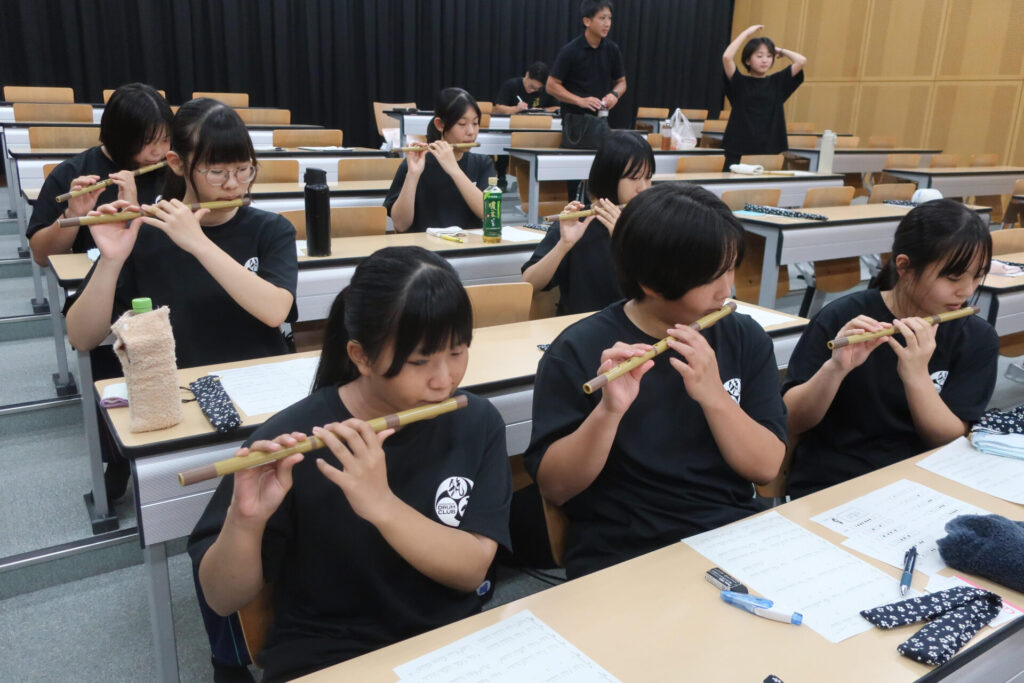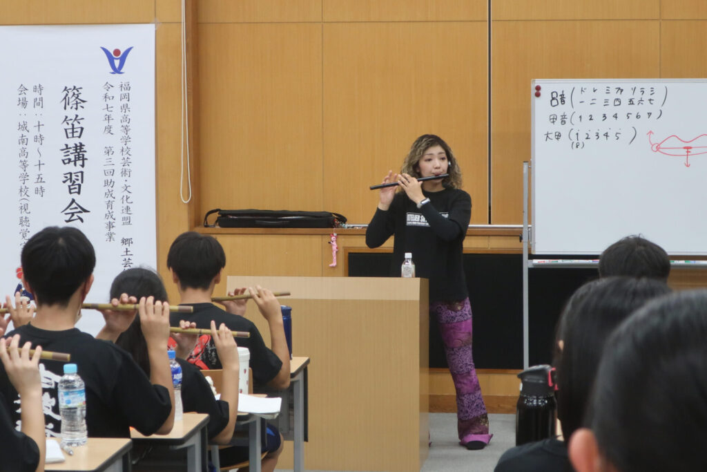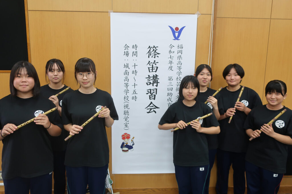 令和7年9月15日月曜日(祝日)に、福岡県立城南高校にて、第3回助成育成事業篠笛講習会が開催されました。本校からは1・2年生7名が参加し、8校52名が受講しました。前半は、篠笛の持ち方や構え方、吹く際の姿勢や運指について、口の形や開け方、息の出し方などを教えていただき、音階と曲練習をしました。後半は、前半に練習した曲の続きの続きを確認しながら、指打ちや高い音を混ぜながら「カノン(二重奏)」を練習しました。篠笛にも色々な種類があることを教えていただき、用途によって使い分けされていることも知りました。また、誰もが今回の講師である野田先生の奏でる美しい音色と指さばきに、すごさと憧れを感じました。先生に教えていただいたことを忘れず、今後も練習を続けて、演奏に厚みを持たせることができる奏者となってほしいと思います!