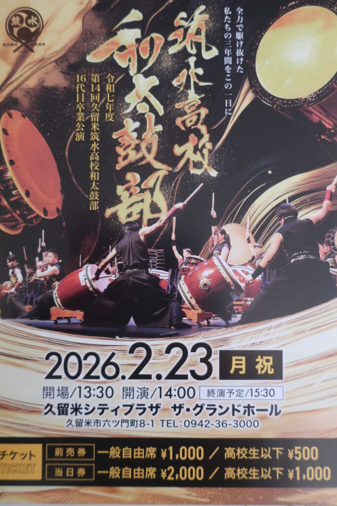 今年度も和太鼓部卒業公演を予定しています!今回で14回目になります。今年は「久留米シティプラザ ザ・グランドホール」にて行います。皆さまとお会いできることを楽しみに部員一同お待ちしております✨!