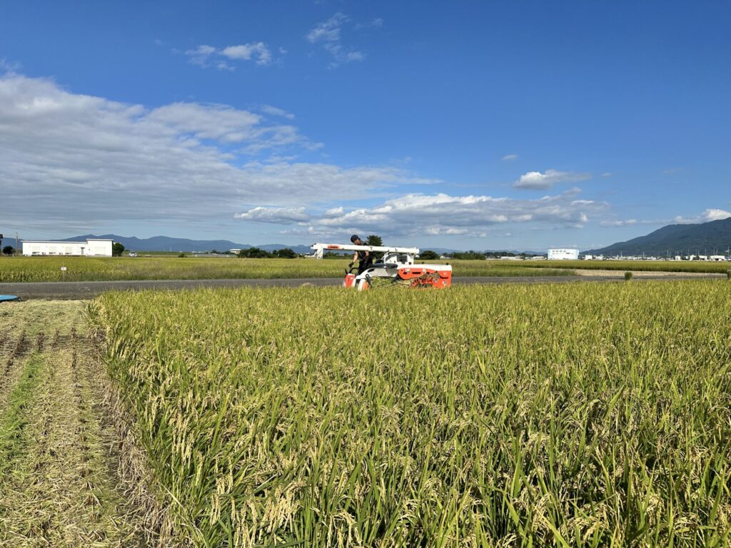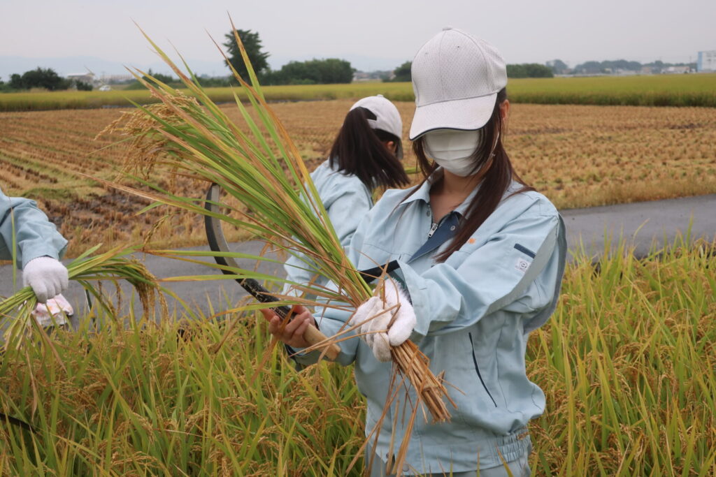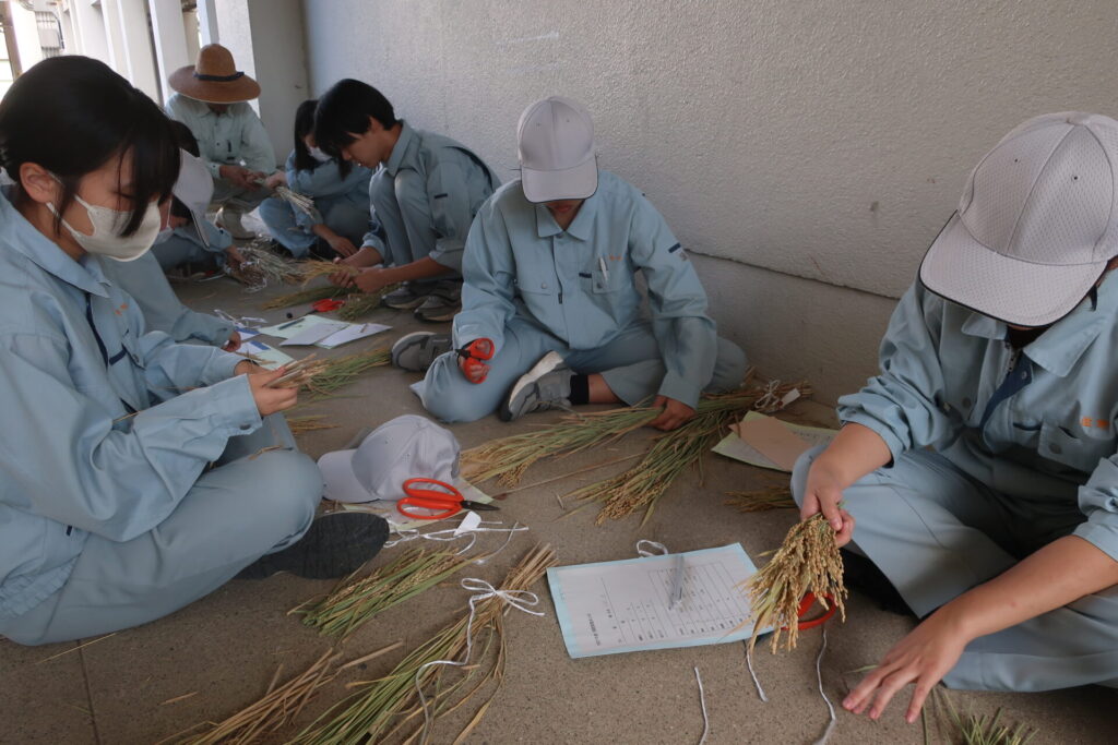 10月上旬に「農業と環境」の授業で栽培している水稲の収穫を行いました!6月に田植えをしてから約3ヵ月程、成長を見守ってきました。夏の猛暑に耐え抜いた稲は大きく成長して籾は膨らみ、立派な稲穂となって収穫することができました。私たちも栽培中は何度も水田へ行き、少しずつ大きくなる稲の様子を観察・記録してきました。稲の株はしっかり張っており、刈り取った重さから沢山の収量が期待できました!自分たちの調査株は学校へ持ち帰り、干して乾燥させ、収量調査や食味調査を行う予定です!また、その他の稲は先生方が機械で刈り取り、ライスセンターへ運搬されました。玄米となって戻ってきた米袋を運んだり、精米したお米を入れる袋の準備を全員で行いました。自分たちで育てたお米。どんな味なのか試食が楽しみです!🍙✌️