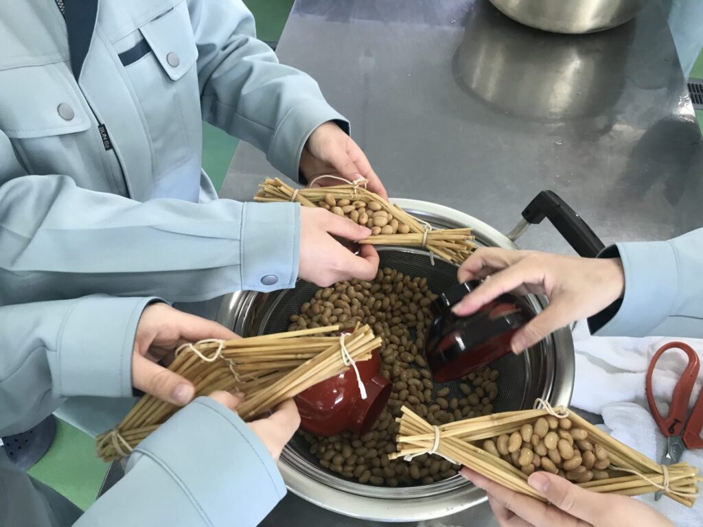 全員がひとつずつ作りました。大豆をこぼさないように結ぶ作業が難しかったです。