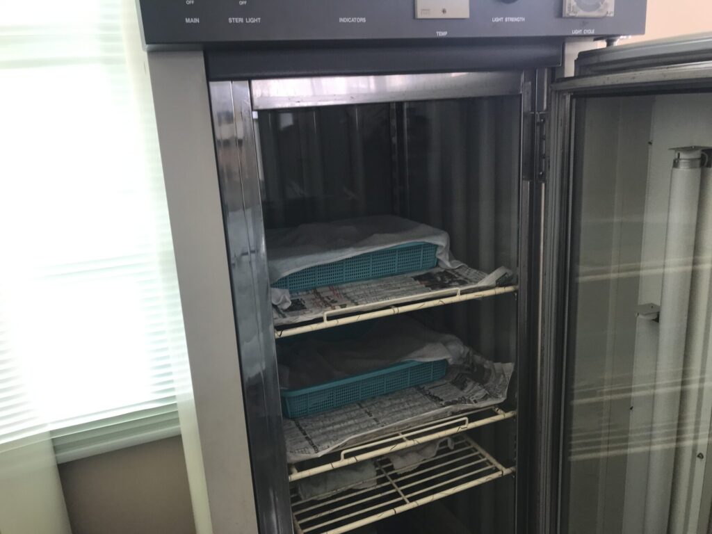 大豆を入れたわらつとを定温器に入れて一晩ねかせます。うまくできますように…